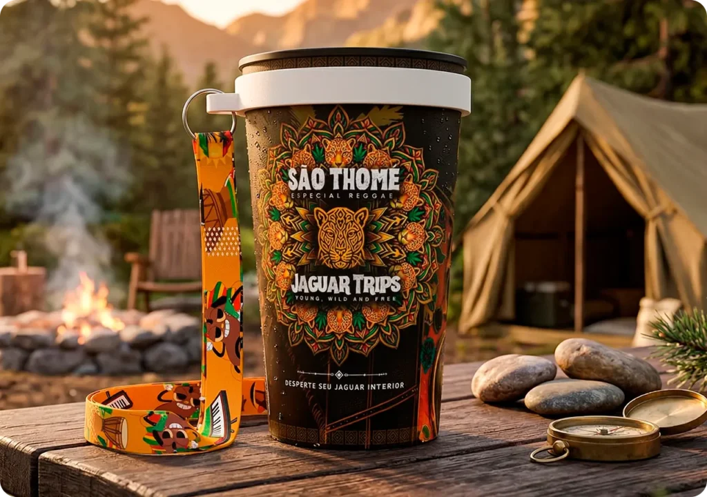 Todo cliente que fecha essa viagem incrível com a gente ganha de presente nosso Copo e Tirante Jaguar Trips! Com estampa exclusiva dessa edição especial, você já entra no clima para nosso Luau e todas as experiências.